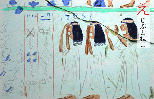 【エジプト猫】 古代エジプトの女性たちは猫をラー以上に崇め、ファラオ以上に愛した。 そのあまりに高きに達した慈しみにより、彼女たちはすべての猫をピラミッドの三角魔法によって草食動物に作り替えてしまったのである。 しかし、ネズミやトカゲを追う楽しみを奪われた猫たちは悲嘆に暮れ、やがて一匹残らずナイル川の向こう岸へと立ち去ることとなる。取り残されたエジプト文明は、大増殖したネズミの大軍によって衰退の一途をたどった。歴史的悲劇の一部始終を、ラムセス王の岩窟神殿内の壁画が余すところなく記している。