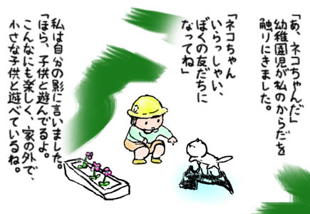 「将来、何になりたい?」と保育所の保母さんに訊ねられて、純は何も答えられない子供でした。 心ひそかに、誰かの花嫁さん(わたくし男です)、それがダメなら、猫になれれば、と思っていましたけど、さすがに言えないや〔苦笑〕。 積極的に望んでいたわけじゃないけれど、どうしても何かにならなければならないとしたら、そのふたつでした。 どちらも実現不可能で、非常に元気のでない子供時代でありました。 2001年11月16日